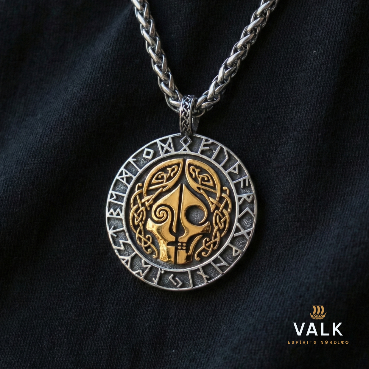 Diseño elegante: En el frente la diosa Hel en dorado, con runas plateadas alrededor. En el reverso un vegvisir, para guiarte.